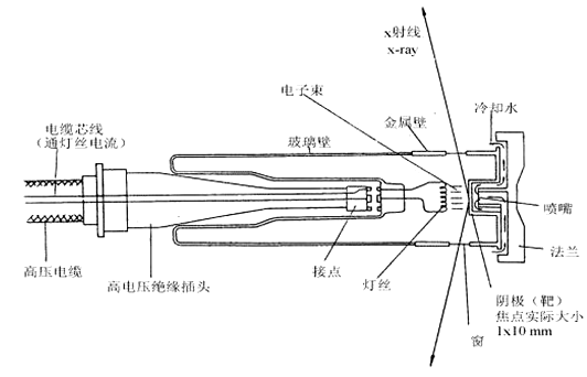 用來產(chǎn)生X射線的裝置是X射線管。它由陰極、陽極和真空玻璃(或金屬陶瓷)外殼組成,其簡單結(jié)構(gòu)和工作原理如圖1所示。陰極通以電流加熱至白熾狀態(tài)時(shí),其陽極周圍形成電子云,當(dāng)在陽極與陰極間施加高壓時(shí),電子加速穿過真空空間,高速運(yùn)動(dòng)的電子束集中轟擊陽極靶子的一個(gè)面積(幾平方毫米左右、稱實(shí)際焦點(diǎn)),電子被阻擋減速和吸收,其部分動(dòng)能(約1%)轉(zhuǎn)換為X射線,其余99%以上的能量變成熱能。